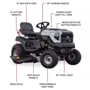 $420.99Original price was: $420.99.$412.57Current price is: $412.57.Murray MT200 42″ Riding Lawn Tractor – Power Meets Comfort Tackle your yard work with confidence using the Murray MT200 Riding Lawn Tractor, built for performance, comfort, and ease of use. Powered by a 19.0 Gross HP 540cc Briggs & Stratton® EX Series engine*, this reliable riding mower is designed to handle up to 2 acres on a single…