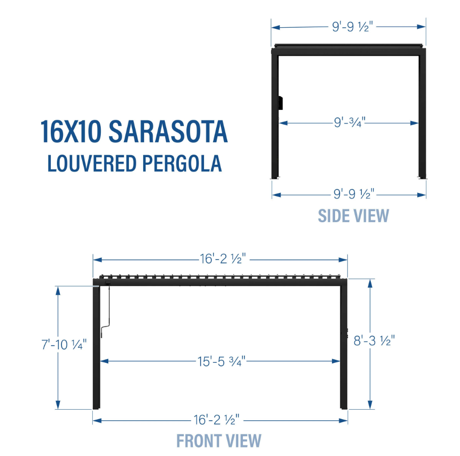 The Sarasota Louvered Pergola elevates your outdoor living space with beautiful modern style. Built with heavy-duty, galvanized steel, its adjustable louvers can be easily opened to allow filtered sunlight through or closed completely to enjoy shade and weather protection. Complete with powder-coated steel posts and anchoring plates, the Sarasota is Pro-Tect™ tested and proven to withstand up to 3,100 pounds of roof weight and 100 mph wind speeds*, ensuring a lasting upgrade to your backyard. The integrated drainage system directs rainwater to downspouts in the steel posts and is equipped with gutter guards to prevent debris blockages. The 100% galvanized powder-coated steel is not only completely maintenance free but is also rust and corrosion-resistant for contemporary charm that’s built to last. Boasting sleek lines and an elegant black finish, this contemporary patio pergola accommodates seating, tables, and decor for a stylish, comfortable outdoor living space. With our patented PowerPort™, featuring three electrical outlets and USB ports, it’s easy to connect lighting, music, devices, and more. This outdoor pergola kit is ready to assemble and offers guided instructions through the BILT® app for easier installation