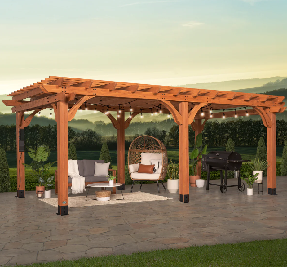 Enhance your backyard with the stunning Beaumont Pergola, where traditional design meets superior engineering. Constructed from 100% cedar wood, it exudes natural charm while providing lasting resistance against decay. From dinner parties to quiet morning coffee, the versatile design creates endless possibilities for your outdoor living space. Thoughtfully crafted with dual structural cross beams, robust support posts, and elegant corbels, this patio pergola delivers exceptional strength and enduring beauty. It’s Pro-Tect tested and proven to withstand winds of up to 100 mph* and includes thick, powder-coated steel anchoring plates, ensuring stability in the most extreme weather conditions. Our patented PowerPort features three USB ports and three electrical outlets to power a wide range of devices, lighting, and accessories. The trellis roof adds a beautiful classic aesthetic and is perfect for hanging potted plants or climbing vines. It also allows sunlight to filter through, creating a pleasant blend of light and shade that’s ideal for outdoor seating areas, patios, and gardens. This wooden pergola kit is ready to assemble with pre-cut, pre-drilled, and pre-stained components, while the interactive BILT app provides guided instructions so you can build your backyard sanctuary with less hassle. Elevate your outdoor lifestyle with the Beaumont Pergola.