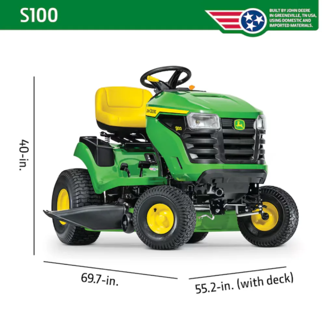 The John Deere S100 is a robust, compact riding lawn tractor engineered to deliver superior performance and durability for residential lawn care. As part of John Deere’s acclaimed 100 Series, the S100 combines cutting‐edge technology with rugged design, making it an ideal choice for homeowners who demand efficiency, comfort, and reliability.
