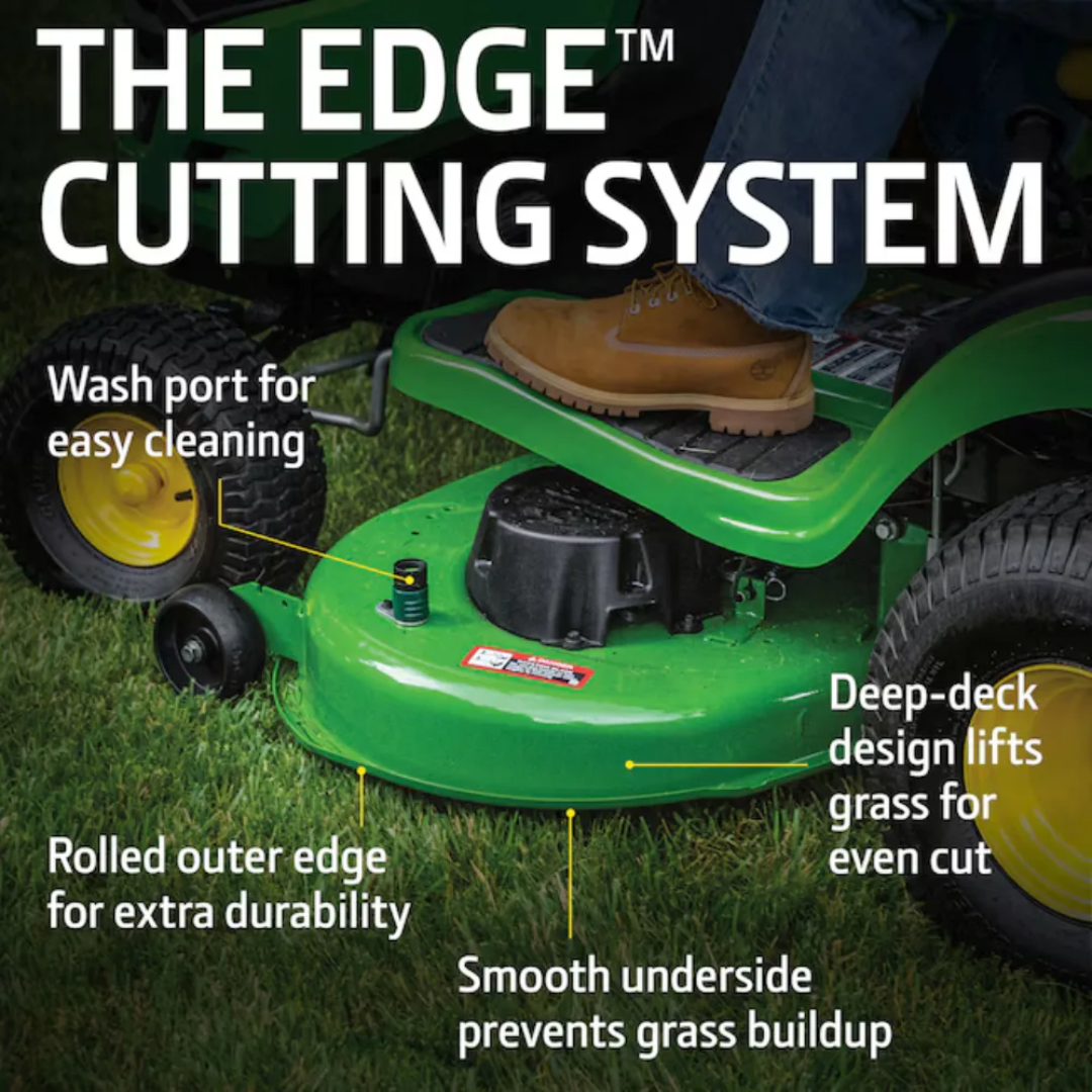 The 42-inch Edge™ Mower Deck is designed to lift grass for a clean, even cut while minimizing clippings buildup. This design not only improves mowing efficiency but also enhances the overall appearance of your lawn.