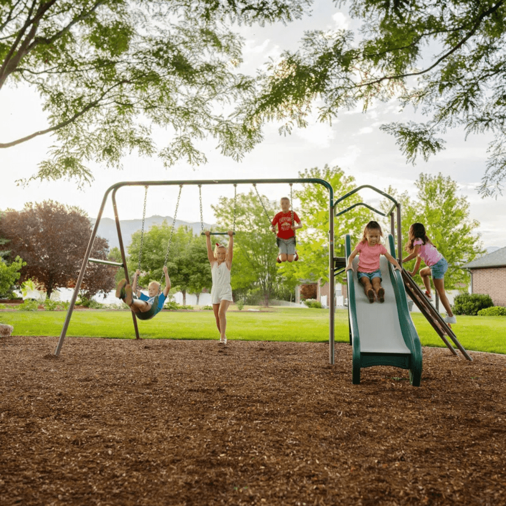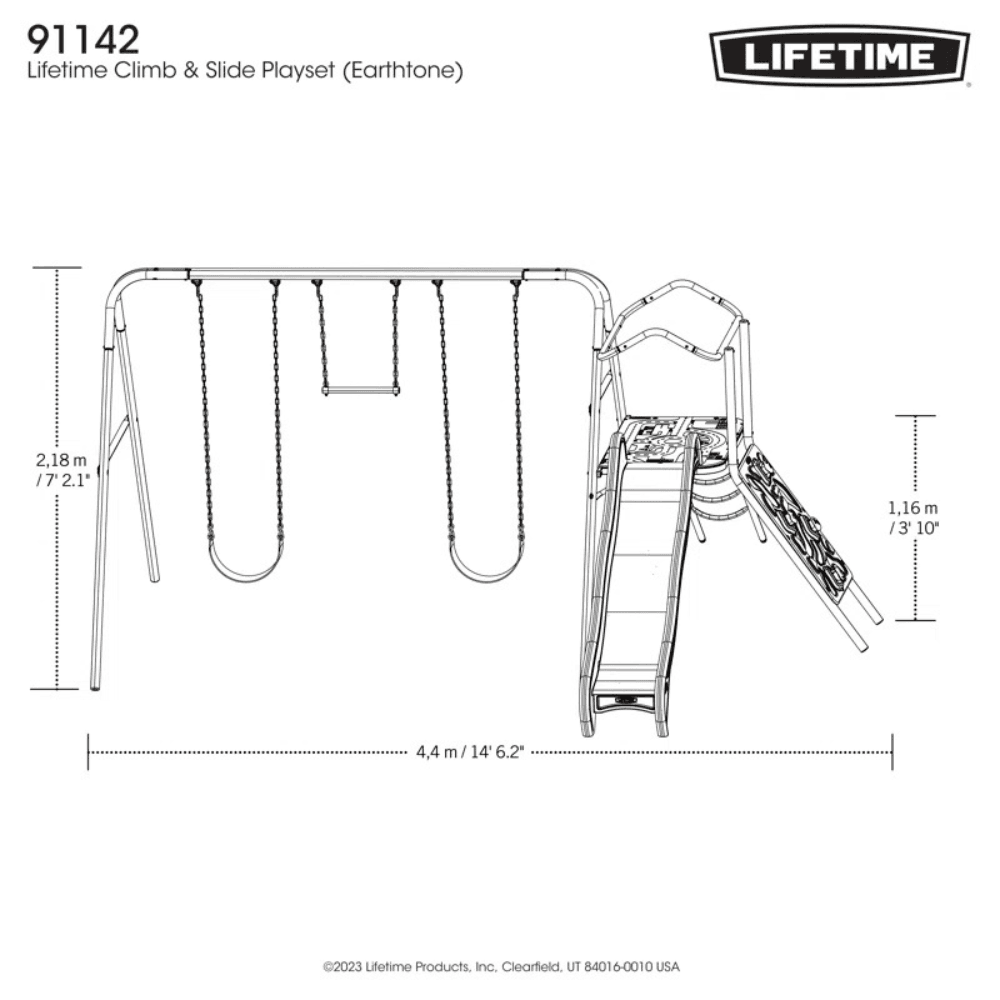 ENDLESS OUTDOOR ADVENTURE FOR ACTIVE KIDSThe Lifetime Climb & Slide Playset is designed to keep kids engaged, active, and entertained with a variety of exciting play activities. Featuring an 8-foot slide, swing set, climbing wall, rung climber, trapeze rings, and an interactive tower, this multi-activity playset creates the perfect backyard playground for kids and their friends.Constructed with durable, UV-resistant materials, this playset resists fading, cracking, and weather damage, ensuring years of fun. Its freestanding design requires no cement, making installation quick and hassle-free.KEY FEATURESExciting Multi-Activity Playset✔ 8-Foot Slide – Fast, smooth, and fun for all ages.✔ 2 Swings – Secure, comfortable, and built for outdoor play.✔ Climbing Wall & Rung Climber – Encourages physical activity and coordination.✔ Trapeze Rings – Provides extra excitement and strength-building play.✔ Interactive Tower with Car Map Floor – Sparks imaginative adventures.Durable & Weather-Resistant Construction✔ UV-resistant materials retain strength and vibrant color over time.✔ Low-maintenance design – no staining or painting required.✔ All-weather construction – won’t crack, warp, rot, or splinter.Safe & Secure for Kids✔ Passes Playground Performance and Safety Standards for maximum child protection.✔ Rounded hard edges and plastic-capped components prevent injuries.✔ Heavy-duty steel frame provides long-lasting stability.Freestanding & Easy to Install✔ No cement or permanent anchoring required – set it up anywhere in your yard.✔ Step-by-step instructions included for a hassle-free installation.WHAT’S INCLUDED?✔ 1 Slide (8-foot length)✔ 1 Climbing Wall & Rung Climber✔ 2 Swings✔ 1 Trapeze Bar with Rings✔ 1 Tower Play Area with Integrated Car Map✔ 1 Ladder for Easy ClimbingWHAT’S NOT INCLUDED?✖ Anchors (not required for freestanding setup, but can be purchased separately for added stability)SPECIFICATIONS• Frame Material: Heavy-duty, weather-resistant steel• Swing Types: 2 Swings & 1 Trapeze Bar with Rings• Slide Length: 8 feet• Safety Compliance: Passes playground performance and safety standards• Weather Resistance: UV-resistant, crack-resistant, and built for outdoor durabilityWHY CHOOSE THE LIFETIME CLIMB & SLIDE PLAYSET?✔ Packed with multiple activities for climbing, swinging, and sliding✔ Durable, UV-resistant materials for long-term outdoor use✔ Low-maintenance – no staining or painting required✔ Safe design with rounded edges and plastic-capped components✔ Freestanding – no cement needed for installation✔ Encourages physical activity and imaginative playINSTALLATION & SAFETY INFORMATION• Place on level ground for maximum stability and safety.• Anchors are not required but can be used for additional security.• Adult supervision recommended for younger children.CONCLUSIONThe Lifetime Climb & Slide Playset is a fun, durable, and safe backyard playset that keeps kids entertained, active, and engaged in outdoor play. With its exciting slide, swings, climbing features, and interactive play area, this playset turns any backyard into an adventure zone.Bring endless fun to your backyard today—let the adventure begin!