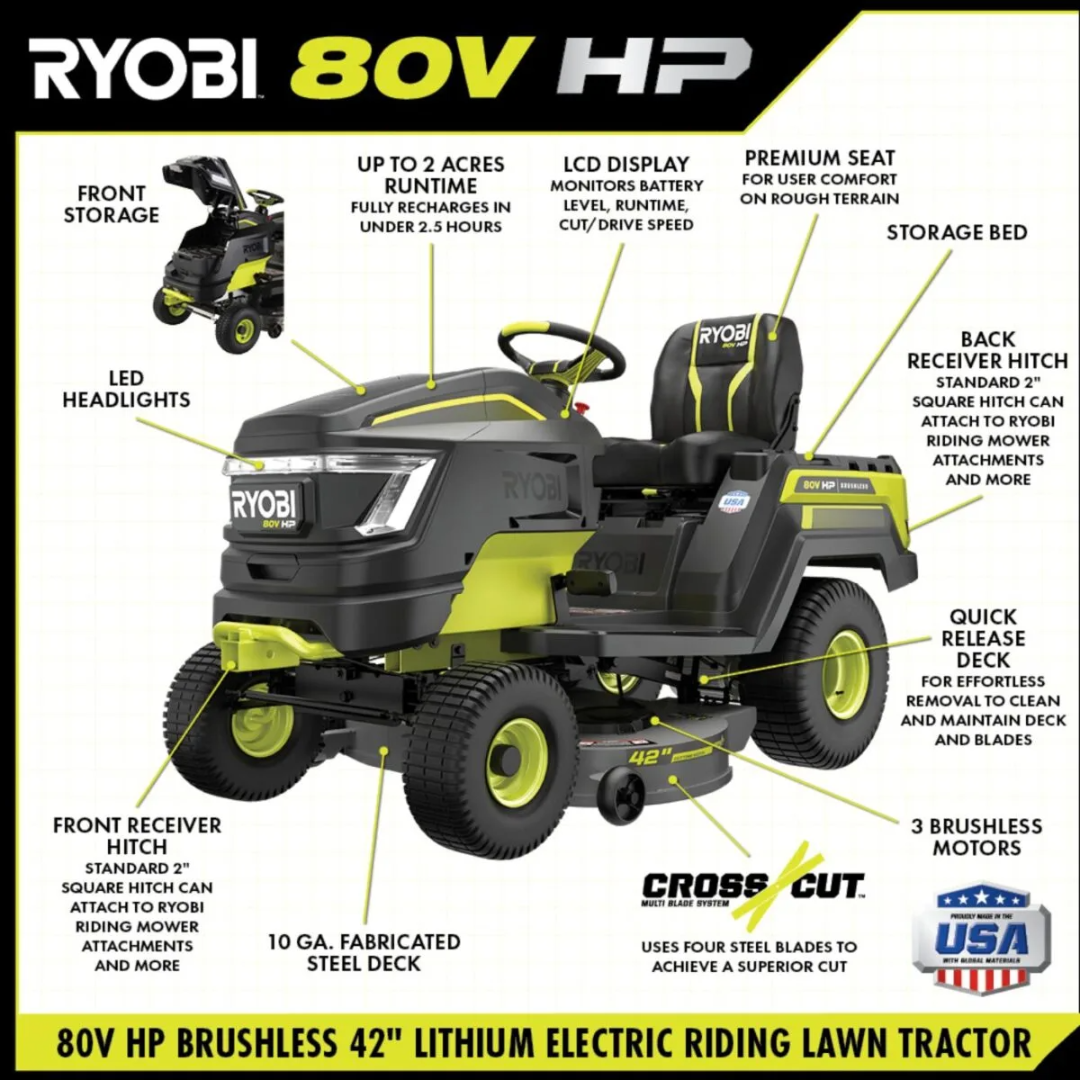 RYOBI 80V HP 42″ Lithium Electric Riding Lawn Tractor – Power Without Compromise