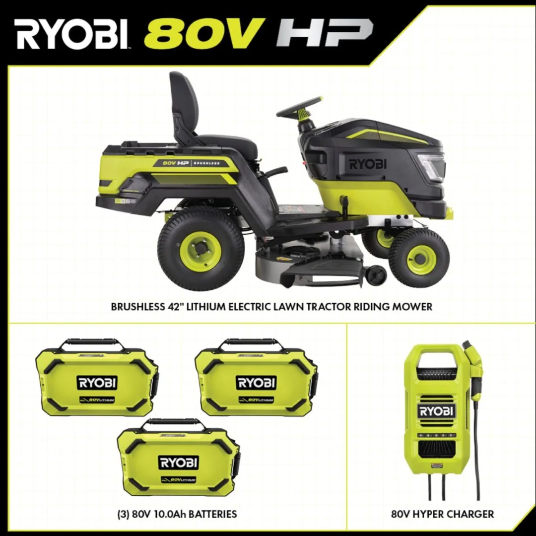 Revolutionize your mowing experience with the RYOBI 80V HP 42″ Electric Riding Lawn Tractor—a high-performance, gas-free solution that combines cutting-edge battery technology with rugged durability and thoughtful convenience features. With the power equivalent of a 21 HP gas engine, this riding tractor is driven by three brushless motors and three 80V 10Ah lithium-ion batteries, delivering the strength to cut up to 2 acres per charge—without fumes, noise, or maintenance.