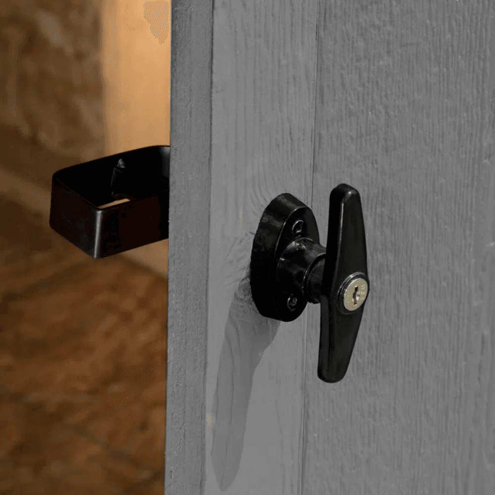 Wide door opening provides easy access for large items like mowers, ladders, and outdoor furniture.