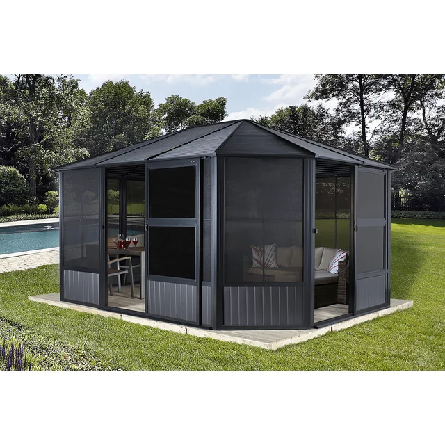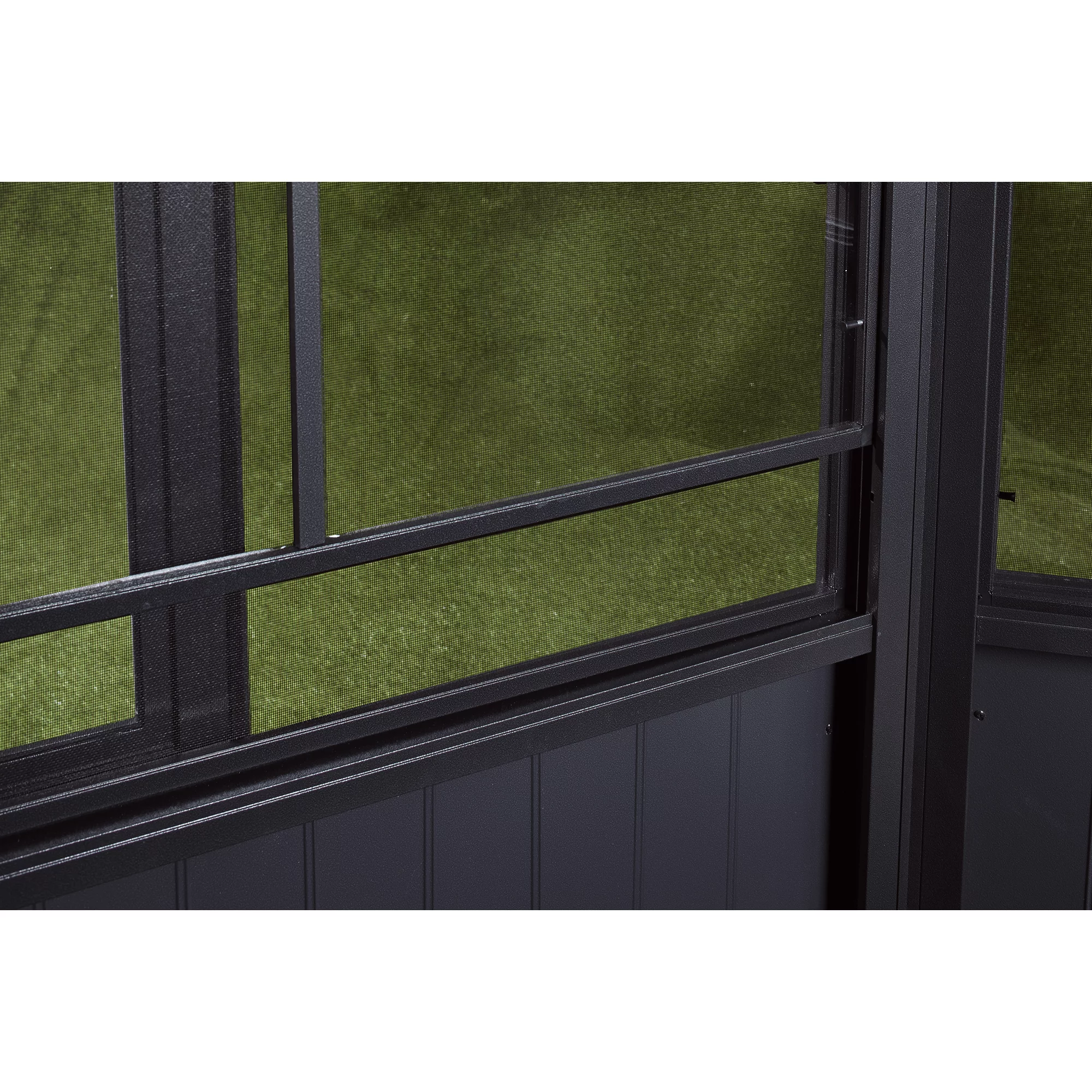 Transform your backyard with the addition of the Charleston solarium. This extension to your home will provide the needed space to gather all your loved ones for an evening of dining and relaxation or it can be used as the perfect shelter for your hot tub. The Charleston boasts a solid aluminum frame with elegant galvanized-steel roof panels. This beautiful addition to your outdoor living space will shelter you from the elements for years to come while adding value to your property.Features premium Interpon AkzoNobel powder coating for maximum protection. Durable and corrosion resistant, premium powder coated dark grey aluminum frame. Premium powder coated galvanized steel roof panels help protect against harmful UV rays. Features 2 single sliding doors with flexible install locations. 3-Position PVC (mica) sliding windows with mosquito netting offer additional ventilation. Although an all-season solarium, any accumulation of snow should always be removed from the roof. DIY assembly with no special tools required