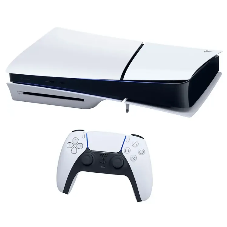 PlayStation 5 Slim console with disc drive and 1TB SSD storage.