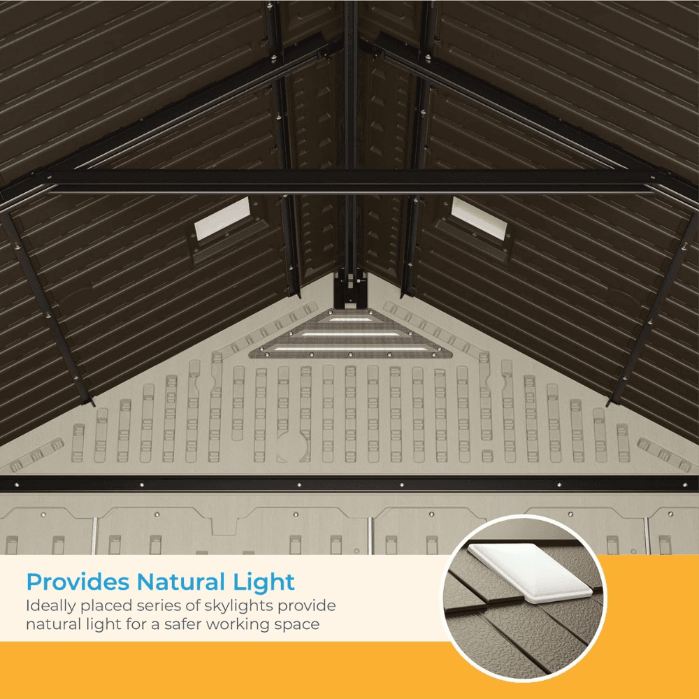 Keep your outdoor space organized and clutter-free with the Suncast Vanilla Resin Storage Shed. Designed for strength, durability, and convenience, this spacious multi-wall resin shed offers ample storage space for power equipment, tools, bicycles, ladders, and other outdoor essentials. Built with weather-resistant polypropylene resin panels and a reinforced heavy-duty floor, this shed provides long-lasting protection against the elements while supporting heavy-duty storage needs.