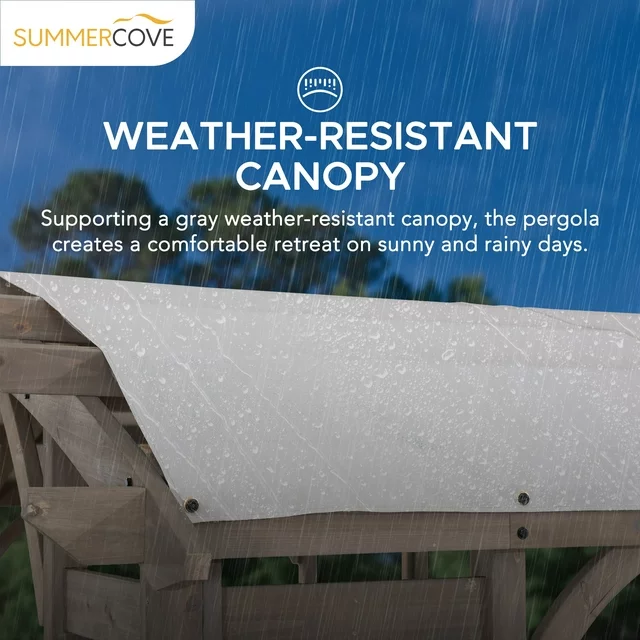With premium Cedar wood frame construction supporting a gray weather-resistant canopy, the pergola creates a comfortable retreat on sunny and rainy days.