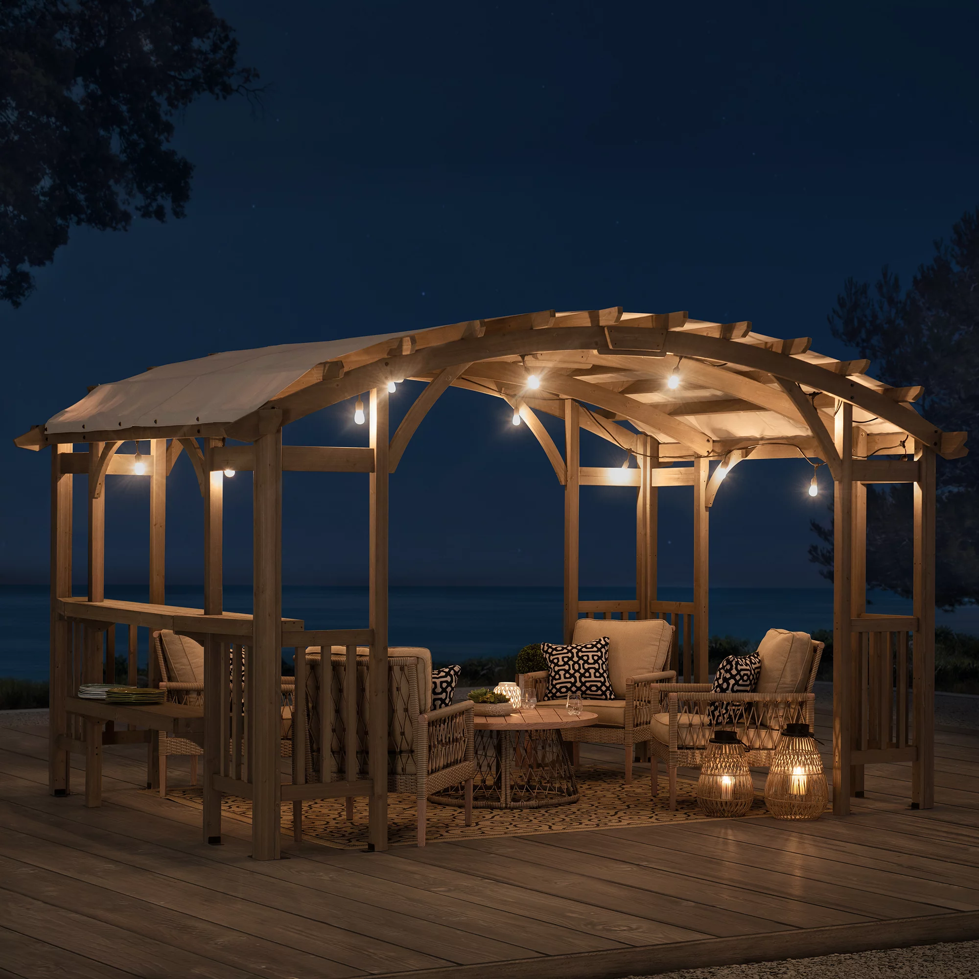 Weather-resistant Canopy: With premium Cedar wood frame construction supporting a light gray sling fabric canopy, the pergola creates a comfortable retreat on the hottest sunny days.