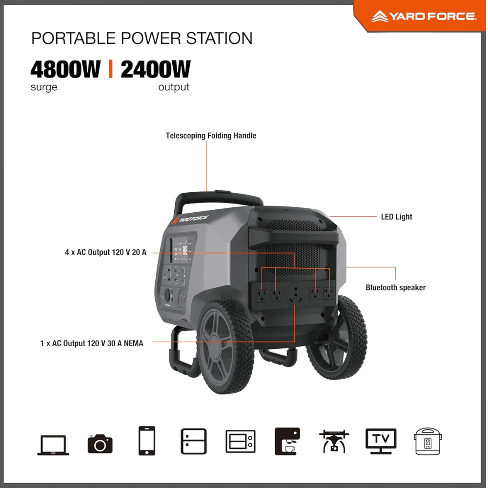 Yard Force Portable Power Station 2400-Watt Continuous 4800-Watt Peak, Bluetooth speaker
